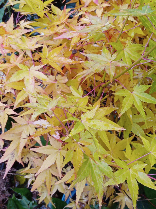 Hier Acer palmatum 'Bi-hoo', der sich derzeit mit zarten Gelb- und Orangetönen schmückt.Das Besondere an diesem Acer ist, dass seine Zweige gelb sind, im Winter sieht das spektakulär aus. Dazu habe ich mir noch den Acer 'Sangokaku' besorgt, der rote Zweige hat. Der hat sein Laub leider schon verloren. Geplant ist, sie gemeinsam in ein Beet zu pflanzen. Andererseits sind Acer gute Kübelpflanzen, Hm, ich überlege noch.